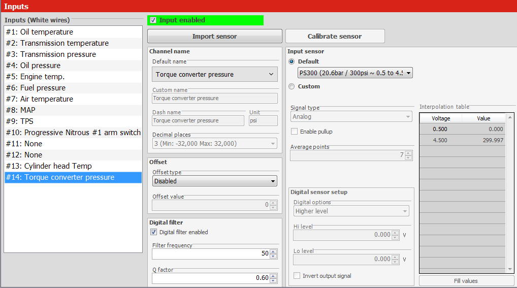 0-300 psi, 0.5-4.5v output, 1/8 NPT connection. A picture is provided with scaling data for this sensor. If you are using fueltech you can use the preprogrammed input for a fueltech 300 psi sensor. Don’t trust your ride to a cheap dry ceramic sensor.